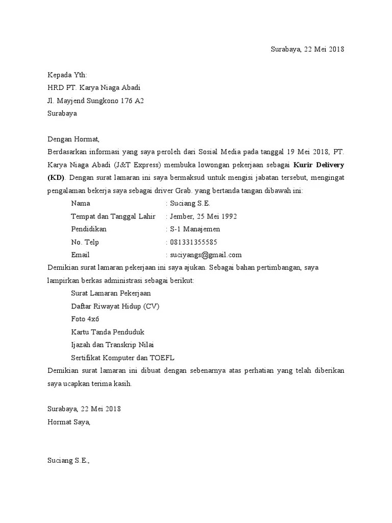 31+ Contoh Lamaran Kerja J&T. Untuk daftar online ketikkan surat lamaran pada email, . Contoh surat lamaran kerja kurir j&t. Contoh surat lamaran kerja untuk j t contoh lif co id : Contoh surat lamaran kerja j&t express : Kali ini admin menulis contoh surat lamaran kerja di jt sebagai kurir. Gaji kurir jne surabaya 2018. Lalu apakah format surat lamaran kerja jnt dengan surat . Format penulisan surat penulisan kerja. (doc) free download contoh surat lamaran kerja kurir jne j&t. Contoh surat lamaran kerja j t express tahun 2020 doc word.